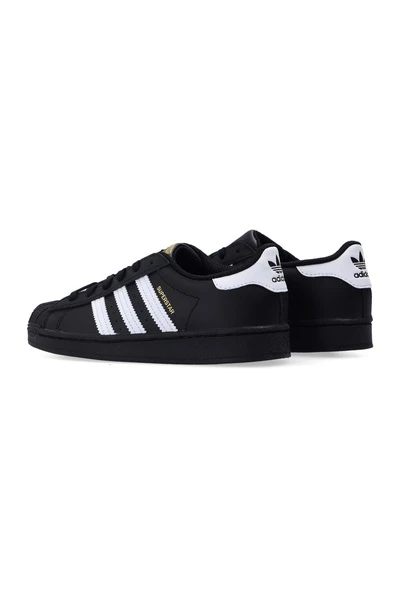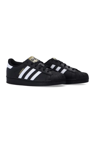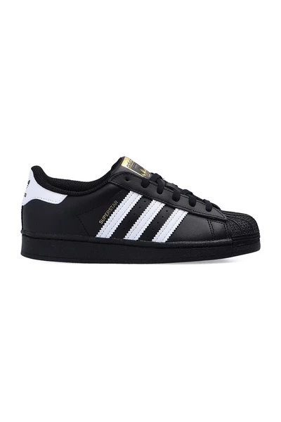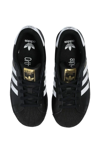 Zwart -wit ‘superster’ sneakers van Adidas Kids. Met de klassieke rubberen shell-teen was dit veterpaar gemaakt van leer en is compleet met de kenmerkende drie strepen van het label aan de zijkanten, logo-applicaties op de tong en achterkant, zwarte rubberen zool en ortholiet® binnenzool met anti-schimmel- en antibacterieel eigendommen.