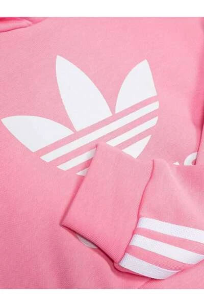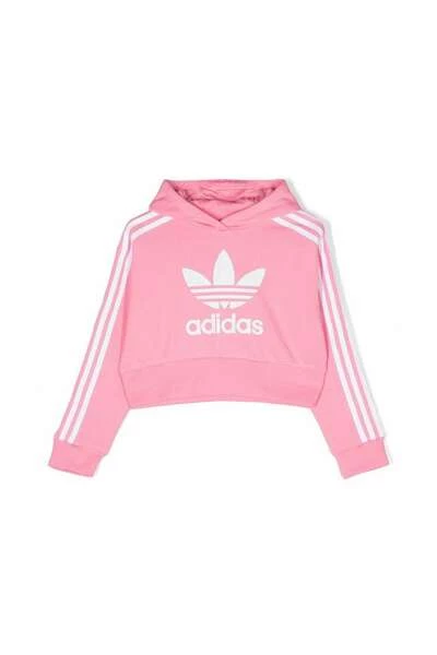 Adidas truien roze adicolor trefoil-print bijgesneden hoodie van adidas kinderen met bubblegum roze, wit, organische katoenen gerecycled polyestermengsel, kenmerkende klaveroglogo-detail, zijstreepdetails, bijgesneden, klassieke kap, lange mouwen en rechte zoom.